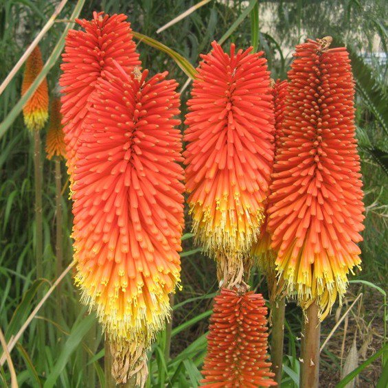 Цветки трубчатые с широким отгибом, поникающие, оранжево-красные, в конечных колосовидных соцветиях на прямом цветоносе, длиной от 60 до 120 см. Цветут в июле — сентябре. В культуре больше используют гибридные формы и сорта, объединяемые под названием книфофия гибридная . Это формы с различной высотой растений, разными оттенками желто-красных цветков и сроками цветения. Известна также книфофия ягодная — одна из самых высокорослых, с серовато-зелеными листьями до 50 см длиной. Верхние цветки кораллово-красные, нижние зеленовато-желтые, в плотном соцветии до 25 см длиной. Цветет с июля в течение двух месяцев. Имеет крупноцветковую разновидность с огненно-красными цветками. Книфофия Мак Ована — высота 60 — 80 см, соцветие небольшое (до 10 см длиной), бутоны оранжево-красные, цветки желтые. Размножают делением кустов весной (в конце апреля — начале мая) и посевом семян в теплице или комнате в марте. Сеянцы пикируют, в грунт высаживают в июне; зацветают на 3-й год. Болезни и вредители не известны. Используют для одиночных и групповых посадок на газоне, в миксбордере. Прекрасно стоят в букетах. |
