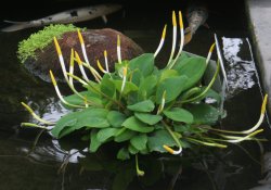 Оронтиум водный, или золотая дубинкаОронтиум водный, или золотая дубинка. Очень необычное растение. Продолговатые темные кожистые листья могут достигать 40 см длины. Соцветия - длинные тонкие ярко-желтые початки - резко контрастируют с белыми утолщенными концами цветоносов. Держат в контейнере с плодородной глинистой почвой, который ставят в самом прогреваемом уголке водоема. При недостатке тепла растение может не зацвести. На зиму нужно убрать его в прохладное помещение, например в зимний сад (10-15 °С) или погреб (3-5 °С), и следить, чтобы почва в контейнере постоянно оставалась влажной. Если растение хранится на свету (в зимнем саду), то оно не сбрасывает листья. Подходит для прибрежной зоны маленьких водоемов. Перспективен для зимних садов и южных районов.