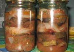 Ингредиенты: 1 кг кабачков, 100 г растительного масла. Для заливки: 1 л свежевыжатого томатного сока, 50 г сахара, перец черный горошком, 30 г соли.